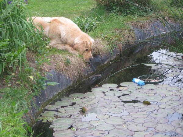 ..Verdammt, ist nicht meine Super-Blaue-Spielwurst in den Koiteich gefallen.....HILFE!!!